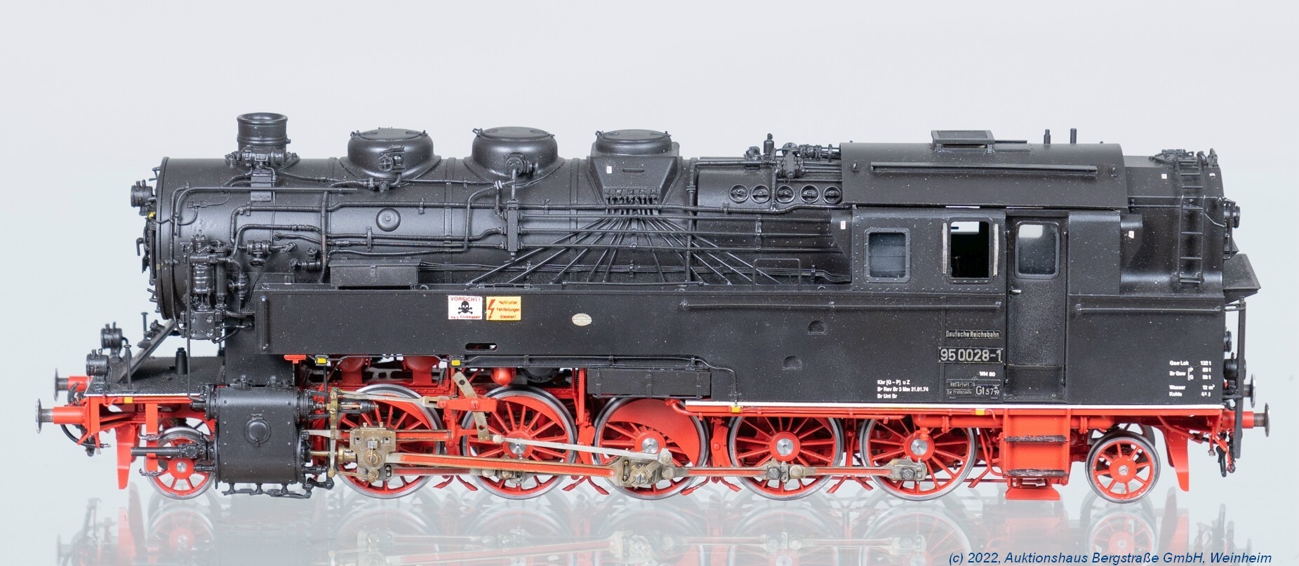 1 Kiss (?) Tenderlokomotive in Messingausführung, Baureihe: 95, Deutsche Reichsbahn, Epoche IV, Betriebsnummer: 95.0028-1, mit Ölfeuerung, Achsfolge: 1'E'1, schwarz/rot, sehr guter Zustand, Anleitung u. Originalkarton(falsch beschriftet)! |