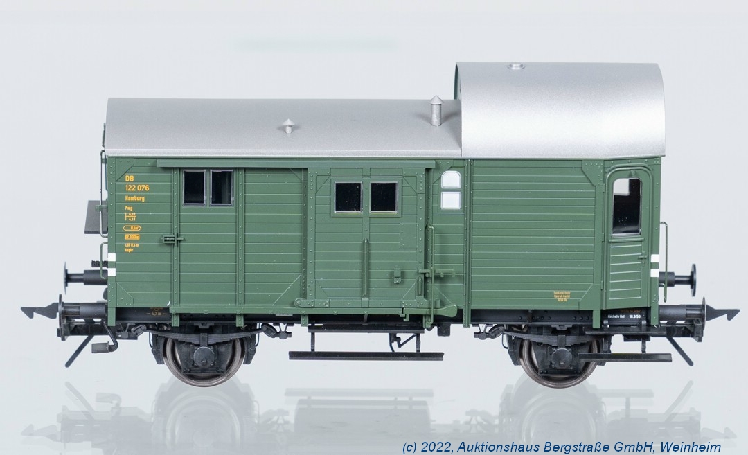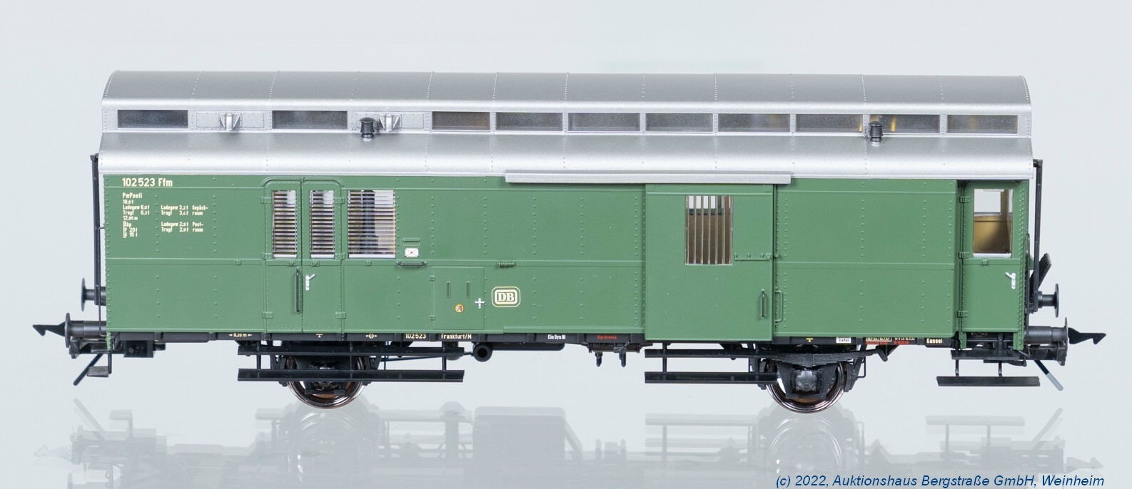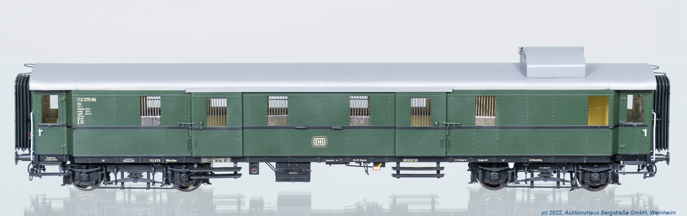 1 Wunder Spur 0: Eilzugpackwagen, 3-achs., Deutsche Bundesbahn, Epoche III, DRG Bauart-Gruppe 30 mit Zugführerkanzel, Wagennummer: 112.076 Mü, grün, Dach: silbergrau, Vorbildkupplungen, Metallmodell, neuwertig, Originalkarton! |
