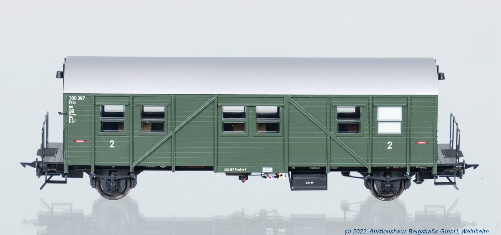 1 Lenz Spur 0: Behelfspersonenwagen 41140-01, mit Bretterwänden, 2-achs., Deutsche Bundesbahn, Epoche III, Wagennummer: 300.387 Ffm, Bauart: MBi, grün, Dach: silber, automatische Kupplung, neuwertig, Originalkarton! |