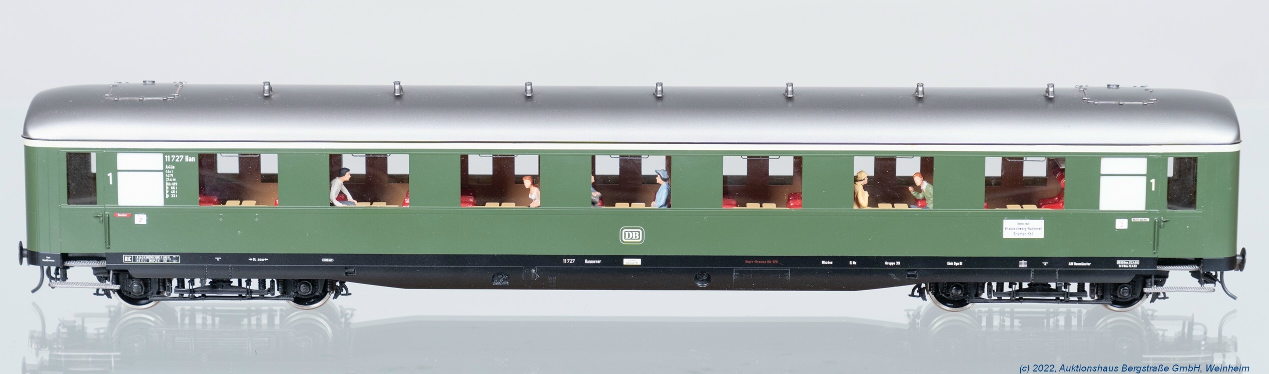 1 Lemaco Schürzenwagen 0-014, 4-achs., Deutsche Bundesbahn, Epoche III, 1.Klasse, Wagennummer: 11.727 Han, grün, Dach: silbergrau, Kadee- Kupplung, Metallmodell, mit Passagieren versehen, neuwertig, Originalkarton! |