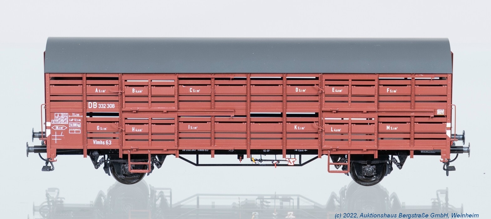 1 Kleinserien Messingmodell Spur 0: Verschlagwagen, 2-achs., Deutsche Bundesbahn, Epoche III, Wagennummer: 332.308 Bauart: Vlmhs63, braun, Vorbildkupplungen, neuwertiger Zustand, Originalkarton! |