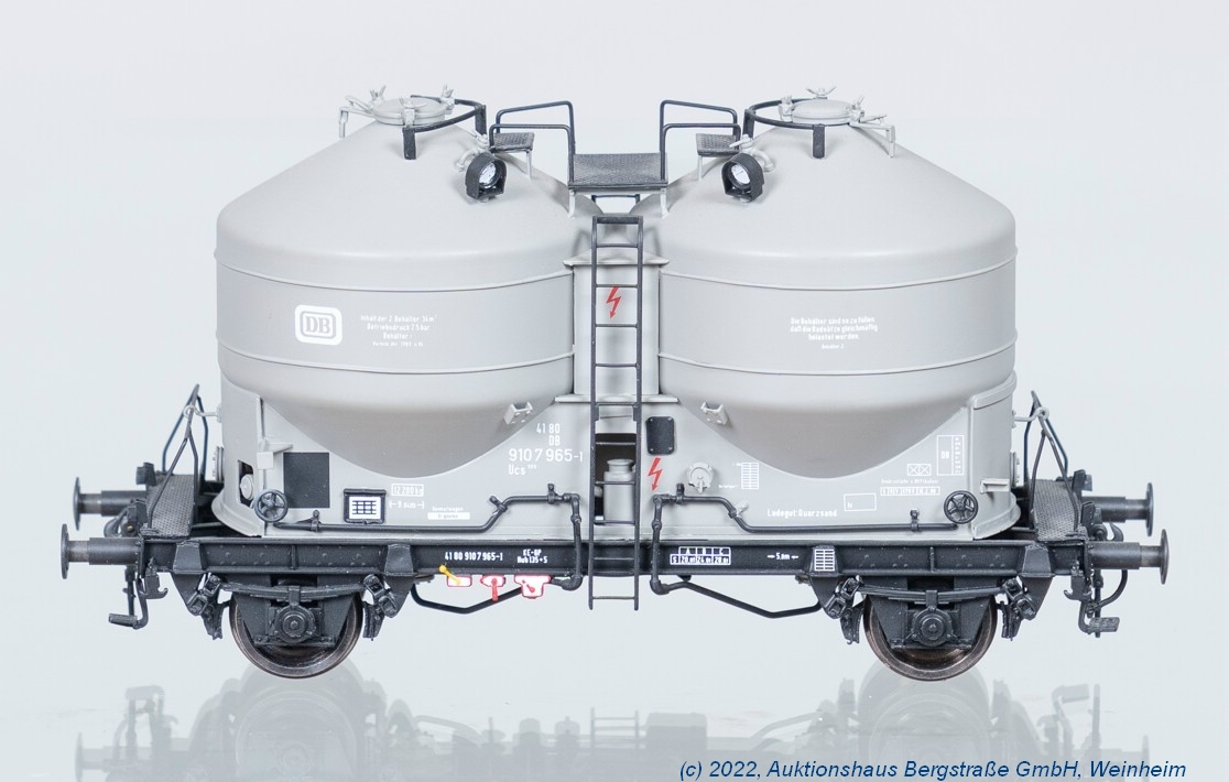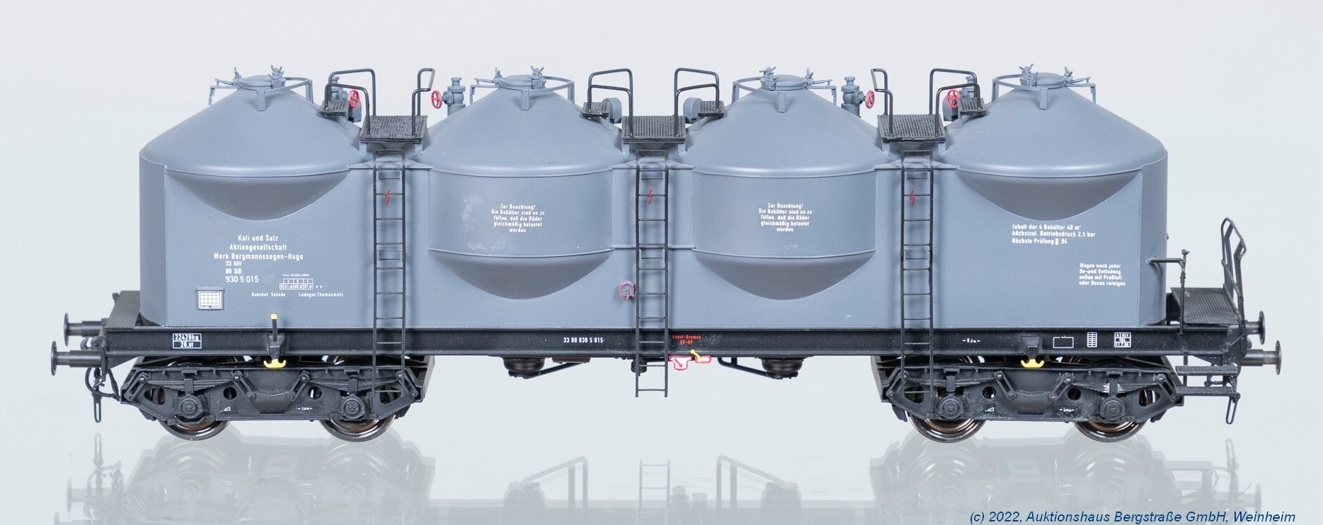 1 Wunder & Kiss Spur 0 Messingmodell: Staubbehälterwagen mit 4 Behältern u. Bremserbühne, Deutsche Bundesbahn, Epoche VI, Wagennummer: 930.5.015, grau, Aufschrift: 'Kali und Salz Aktiengesellschaft - Werk Bergmannssegen-Hugo', Vorbildkupplungen, feinstdetailliert (!), neuwertiger Zustand, Originalkarton! |