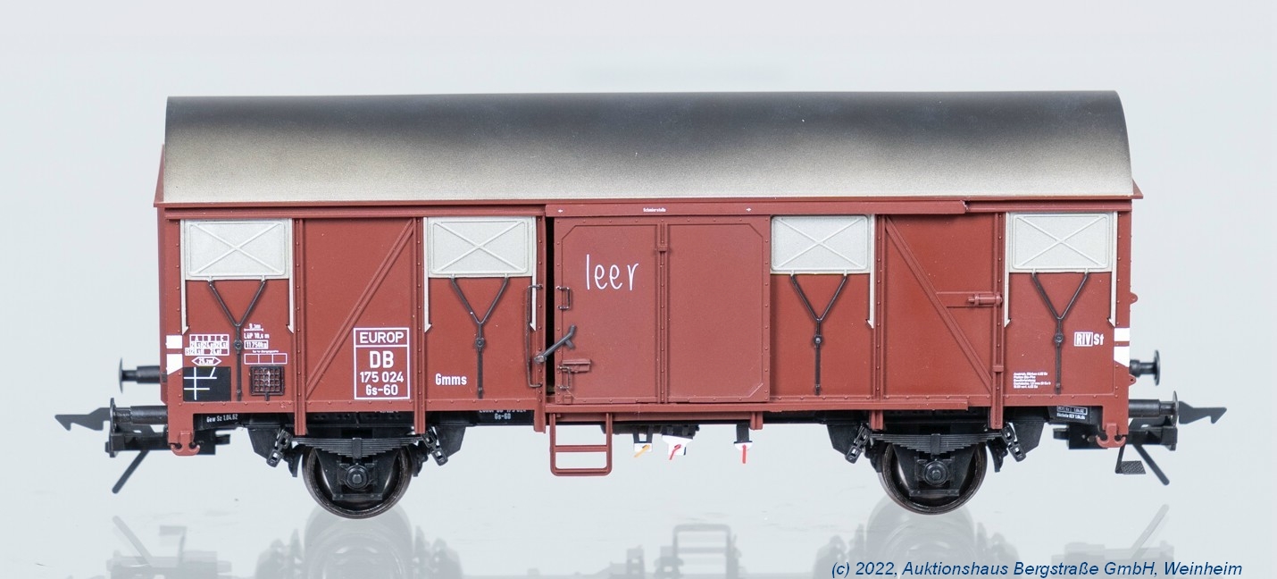 1 MBW Spur 0: Gedeckter Güterwagen 80066, 2-achs., Deutsche Bundesbahn, Epoche III, Wagennummer: 175.024 EUROP, Bauart: Gmms60, braun, silberne Lüftungsklappen, Dach: silbergrau, neuwertig, Originalkarton! |