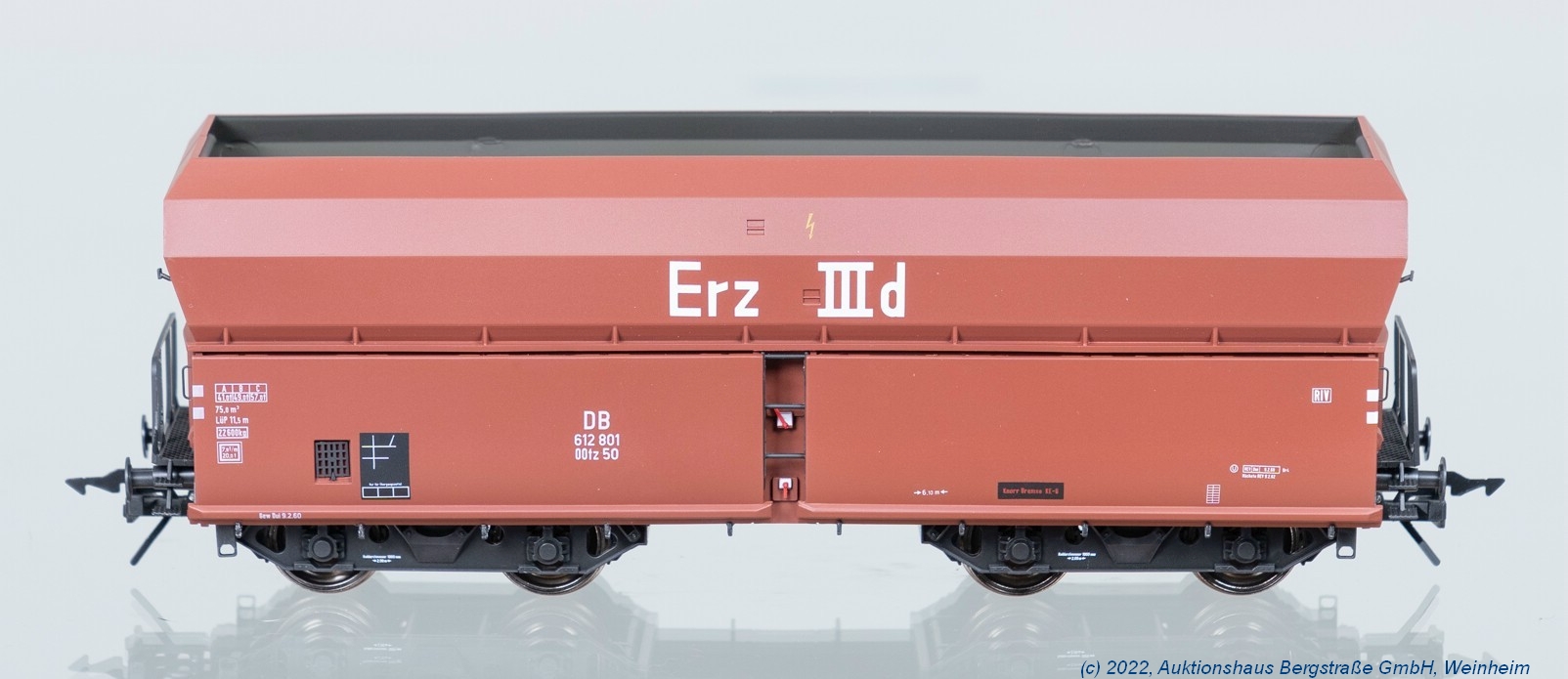 1 MBW Spur 0: Erzwagen 80405, 4-achs., Deutsche Bundesbahn, Epoche III, Wagennummer: 612.005, Bauart: OOtz50, braun, Aufschrift: 'Erz IIId', automatische Kupplungen, neuwertig, Originalkarton! |